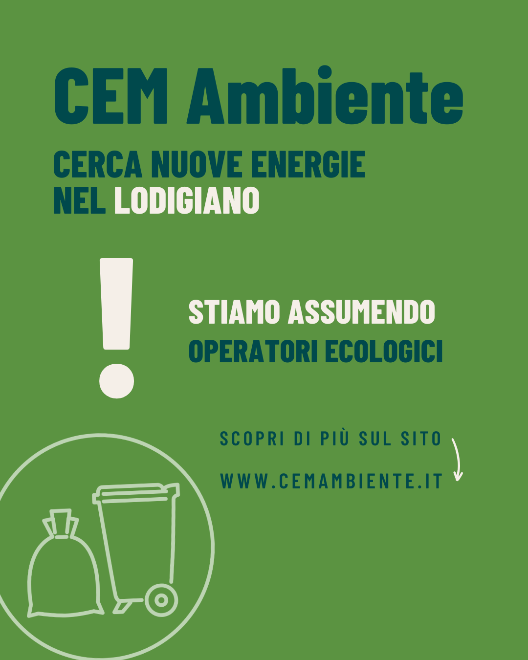CEM Ambiente continua a crescere e cerca nuove figure da inserire nel proprio organico. È aperta una selezione per la formazione di una graduatoria finalizzata all’assunzione, a tempo pieno e determinato (6 mesi, prorogabili fino a 12)di assistenti operatori e operatrici ecologiche per i dei servizi di igiene urbana da destinare alla zona del lodigiano. Le assunzioni potranno essere trasformate a tempo indeterminato in base alle esigenze aziendali.